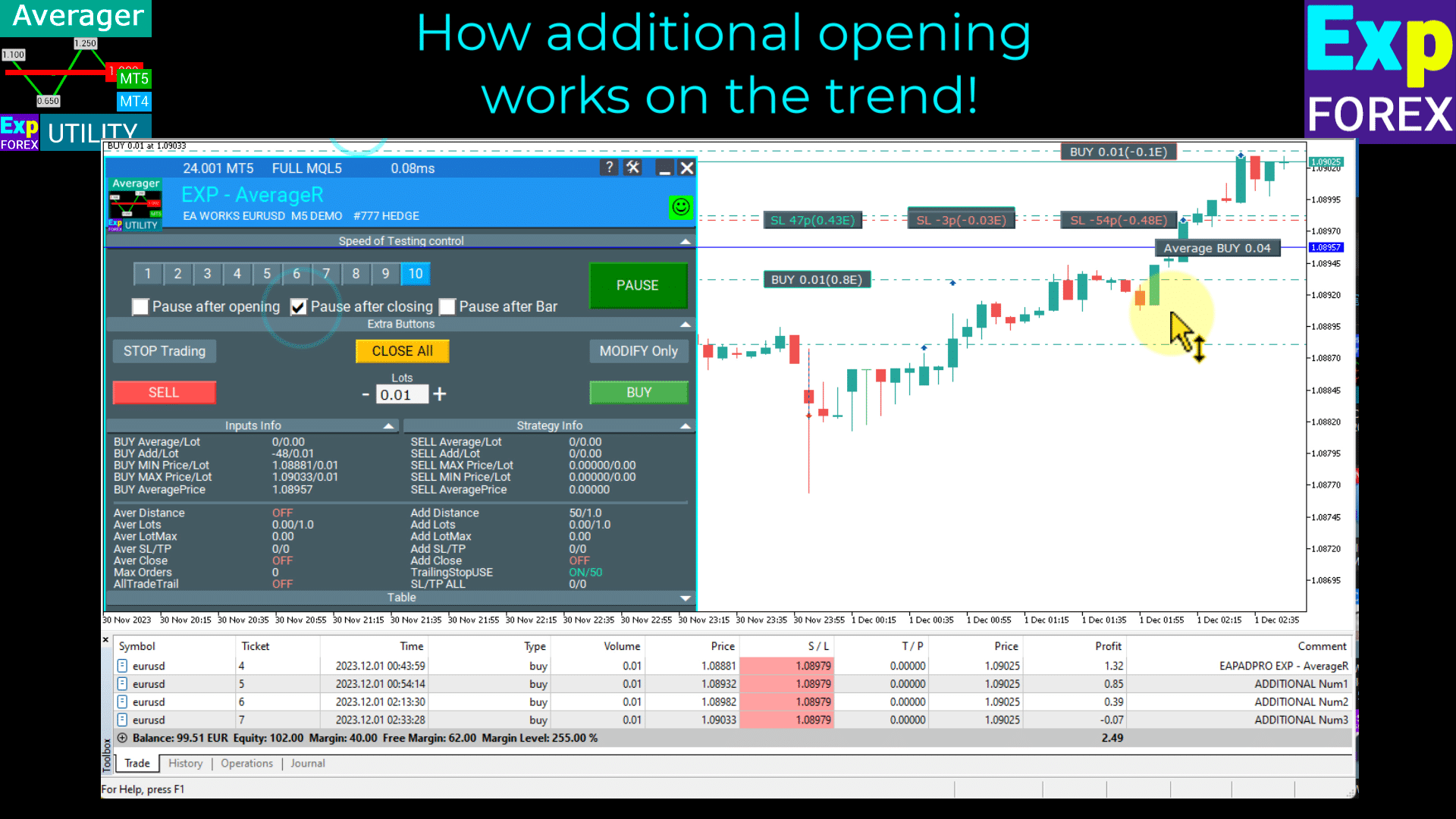 Stratégie de moyenne des positions :L’Averager est couramment utilisé pour ramener les positions non rentables au prix moyen. Cela consiste à ouvrir de nouvelles positions dans la même direction que la position initiale, mais à un niveau de prix différent. En procédant ainsi, le trader rapproche le prix moyen de la position au niveau actuel du marché, ce qui peut réduire les pertes.