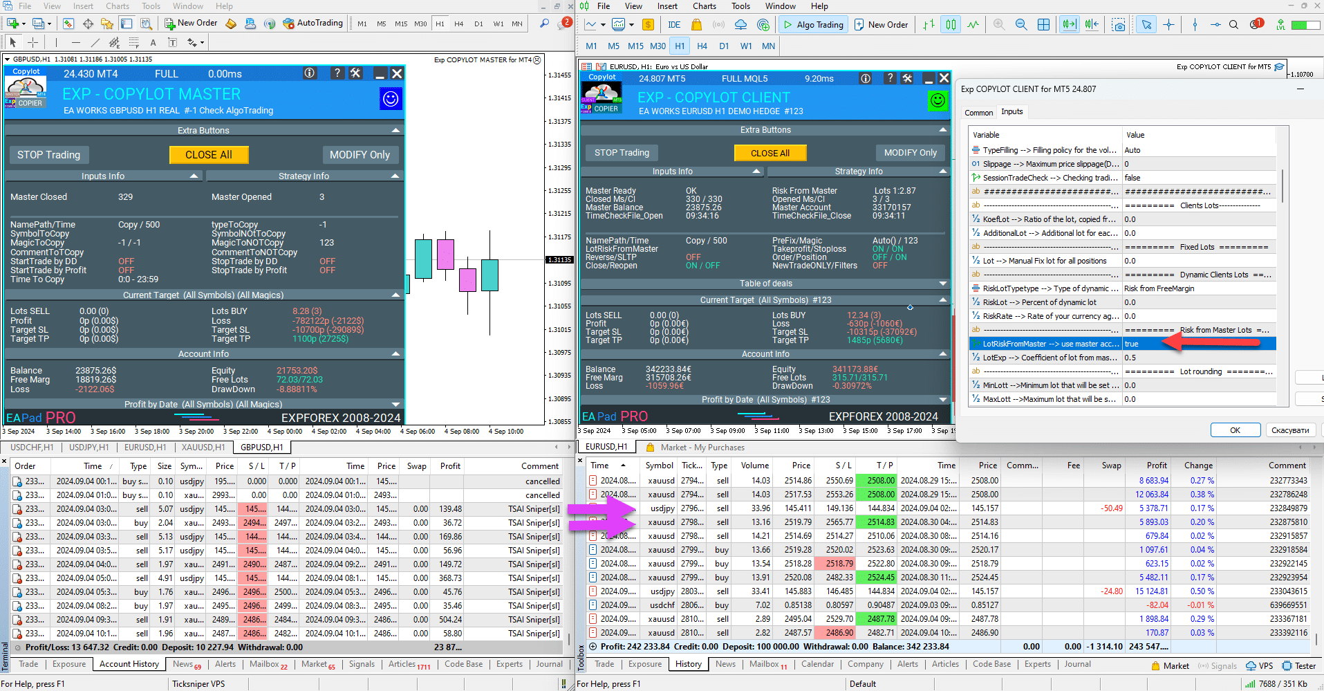 - Copying lot (volume) based on risk from the master to the client (opening lots on the client with risk as a percentage of the master’s account).