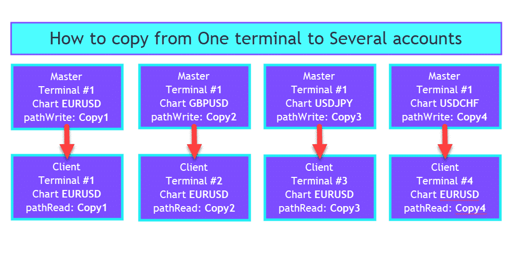 Além disso, você pode copiar de uma conta fechada que foi aberta usando a senha de investidor, fazer um fechamento parcial apenas de MT4 para MT4, copiar de uma conta demo para uma conta real, copiar de vários terminais para um, copiar de um terminal para vários outros, e copiar de diferentes corretores para qualquer outro corretor.