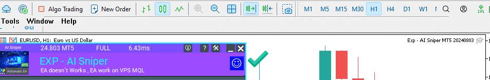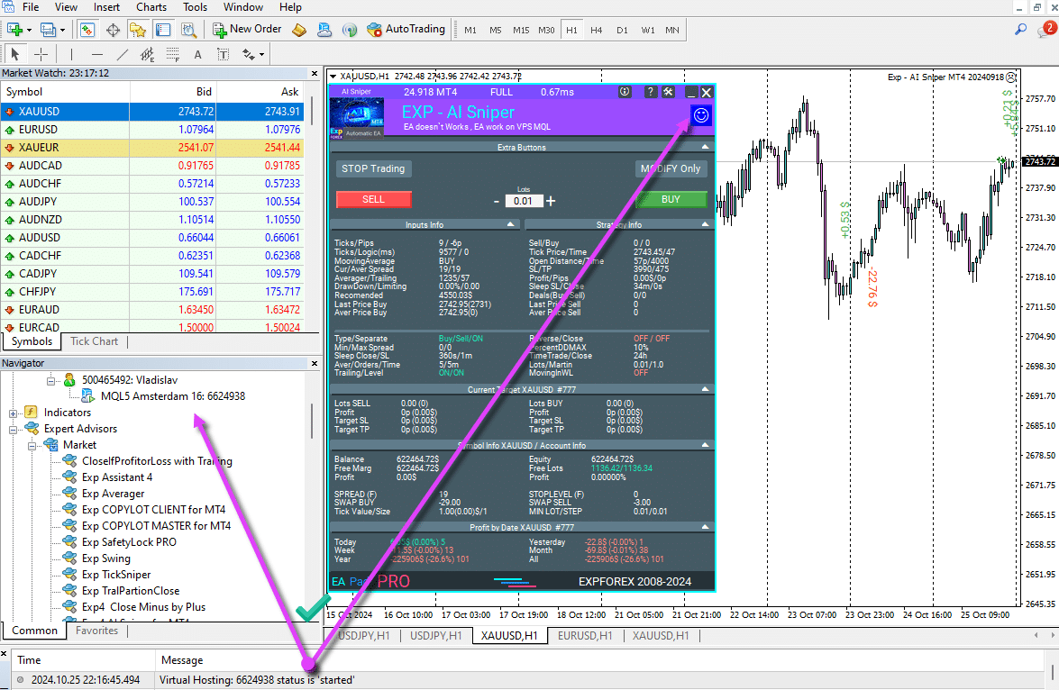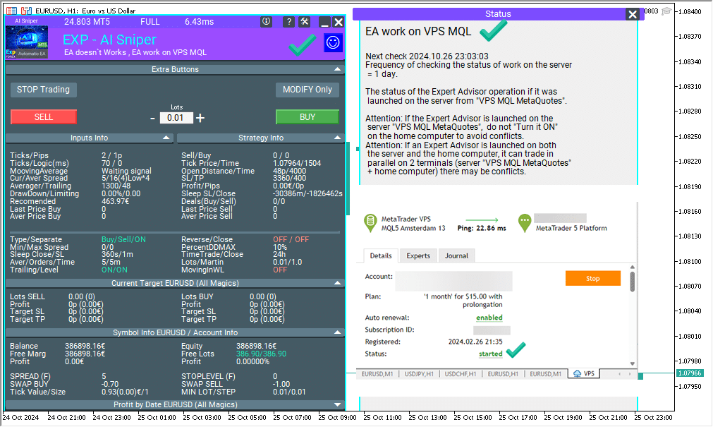 We turned off our terminal and verified the TickSniper Expert Advisor (EA) on a VPS server from MetaQuotes and confirmed that the advisor was successfully trading on the virtual server.