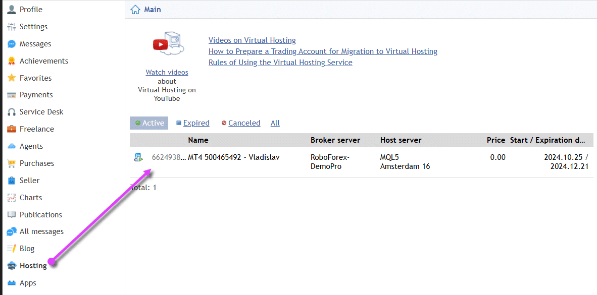 The personal account on the website MetaQuotes allows you to view your hosting subscription: