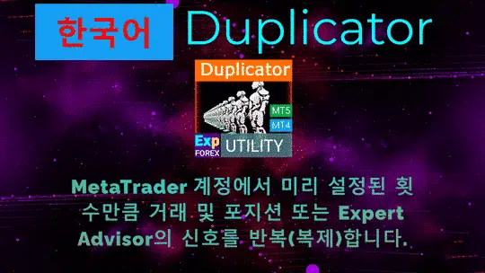 Exp-Duplicator는 자동 Expert Advisor로, 사용자의 MetaTrader 계정에서 미리 설정된 횟수만큼 거래 복제 및 포지션을 복제하도록 설계되었습니다.