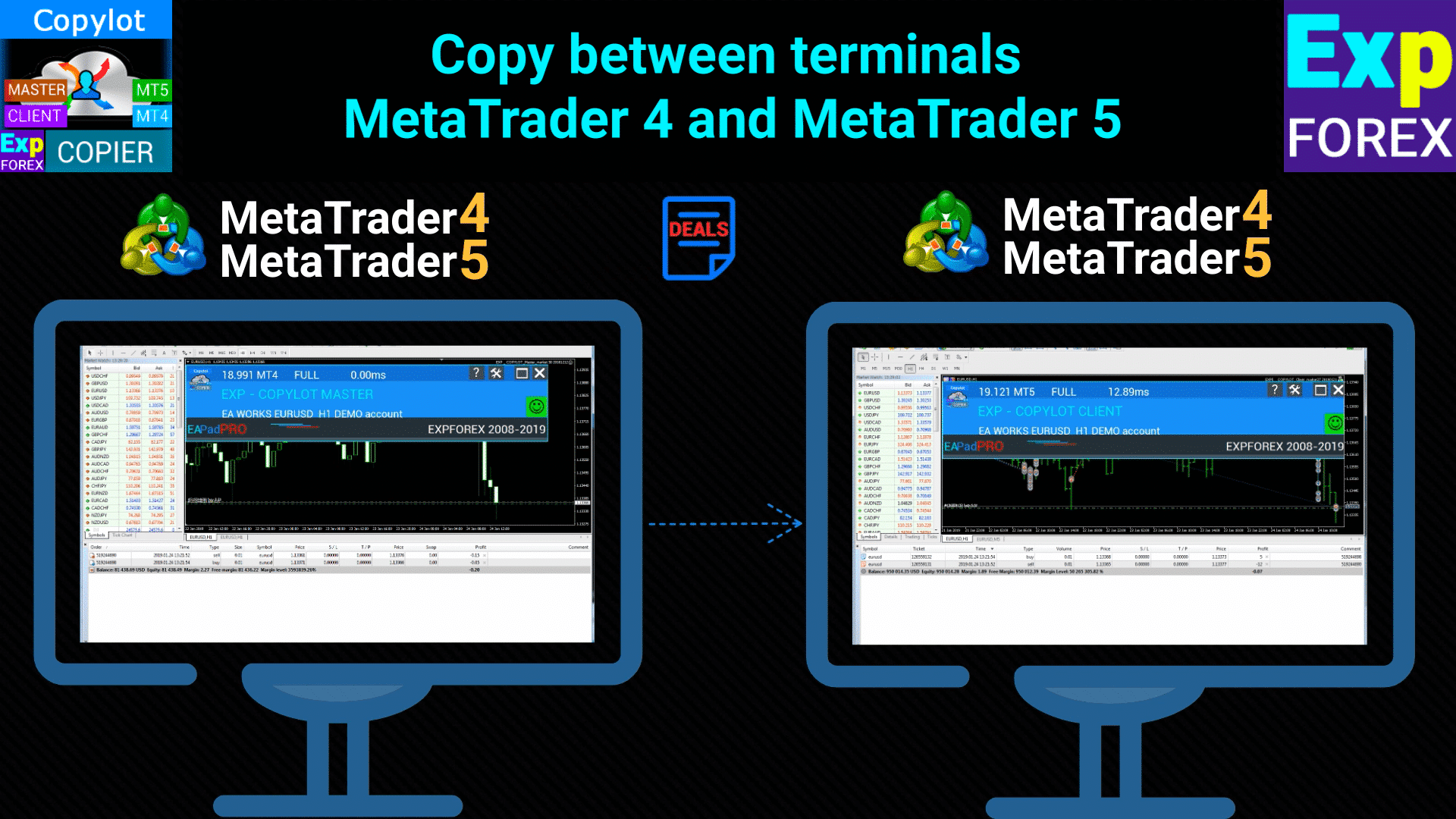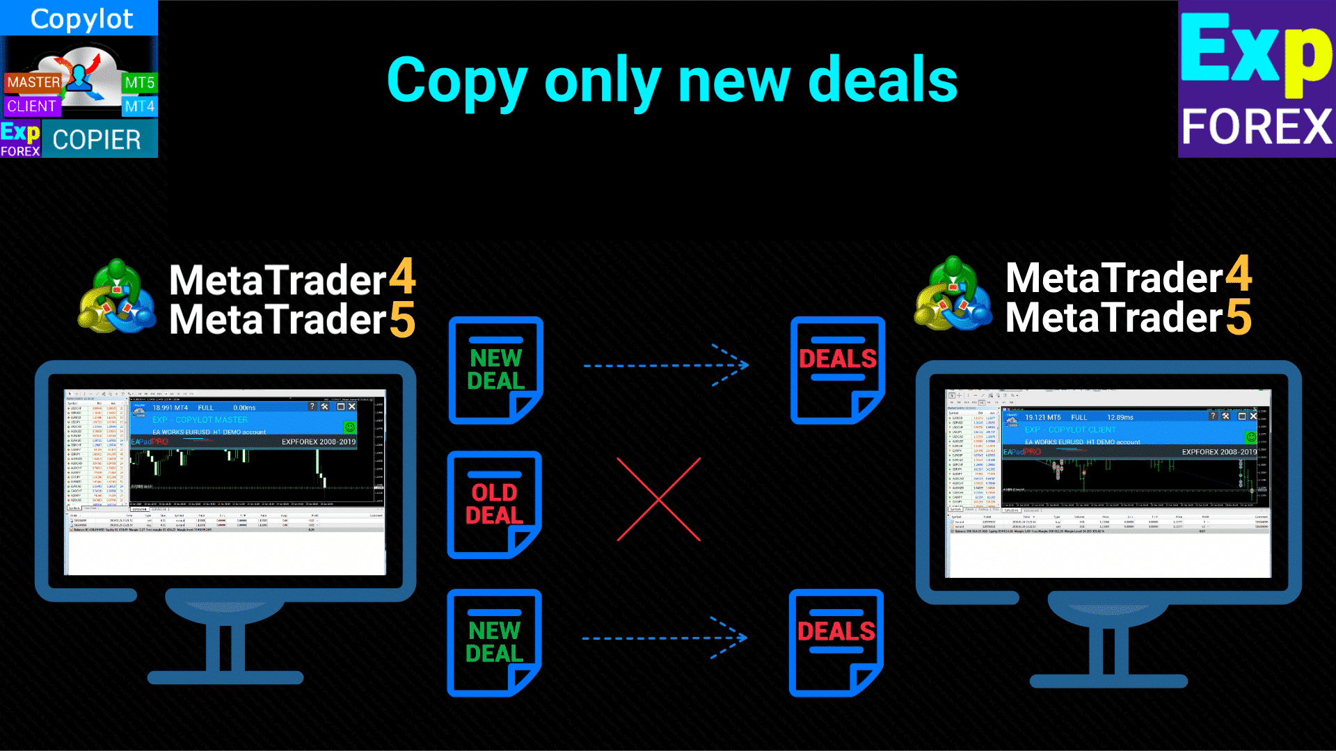 Thuật toán sao chép độc đáo sao chép chính xác tất cả các vị thế (Giao dịch (Deals)) từ tài khoản chính (master account) sang tài khoản khách (client account) của bạn.