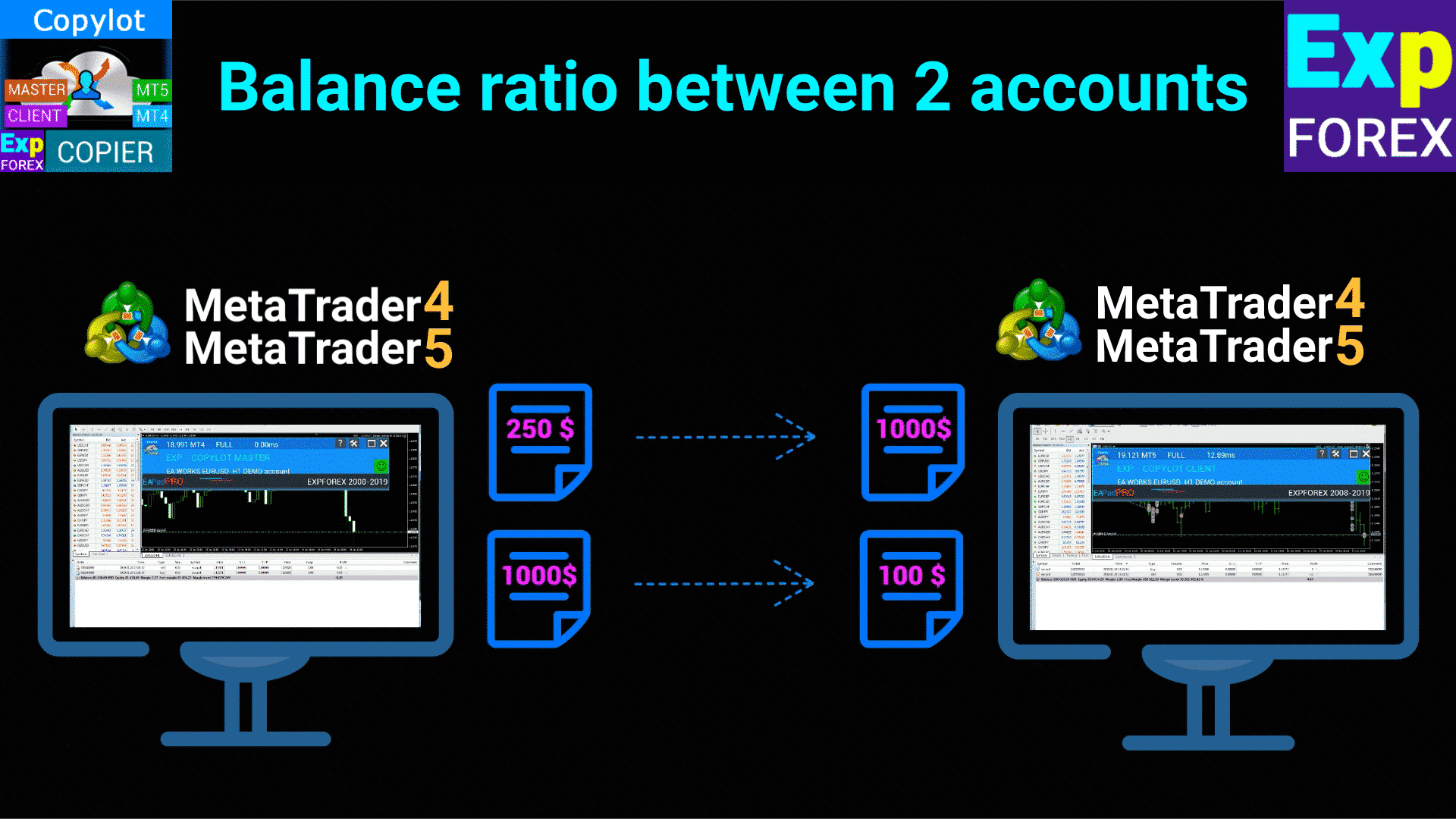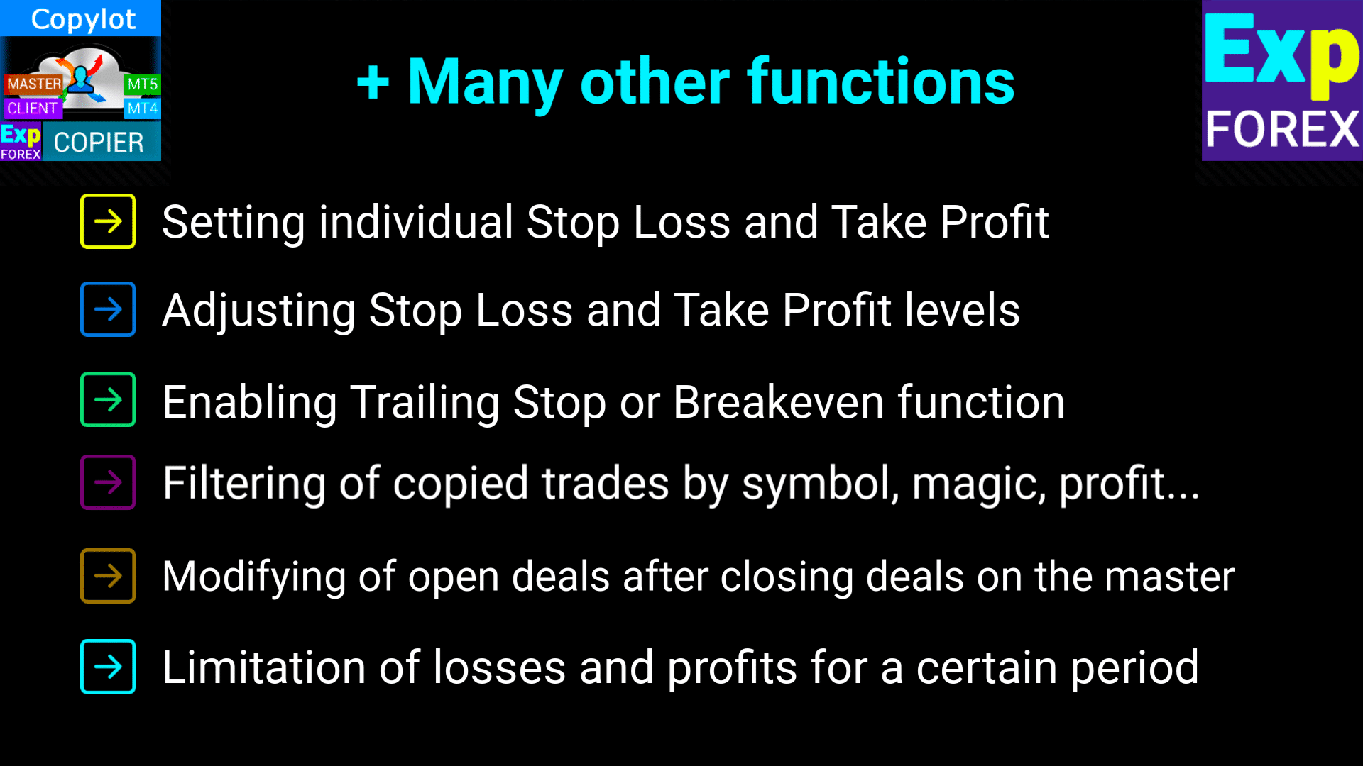 Além disso, você pode copiar de uma conta fechada que foi aberta usando a senha de investidor, fazer um fechamento parcial apenas de MT4 para MT4, copiar de uma conta demo para uma conta real, copiar de vários terminais para um, copiar de um terminal para vários outros, e copiar de diferentes corretores para qualquer outro corretor.